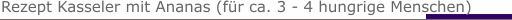 800 g Kasseler Kamm 1 Ananas 3 Knoblauchzehen 2 grosse Zwiebeln 2 - 3 Esslöffel Öl 1 Becher süsse Sahne Pfeffer Curry Scharfes Paprikapulver Salz Kein Ketchup (hat zu viel Zucker !!!)